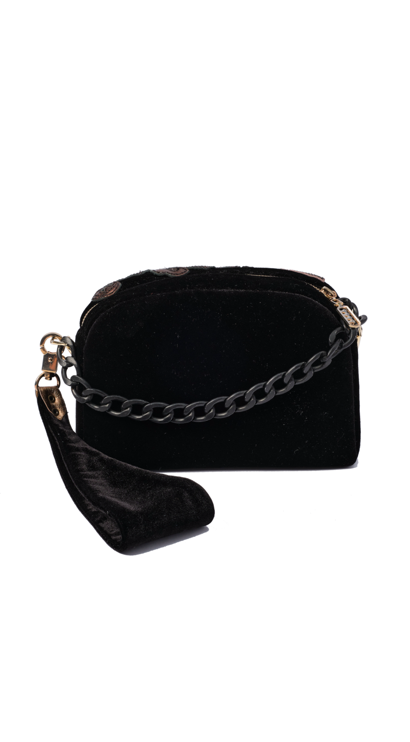 Сумка из шелкового бархата, с кожаной аппликацией в виде цветов и с черной цепочкой. Закрывается сверху металлической молнией.