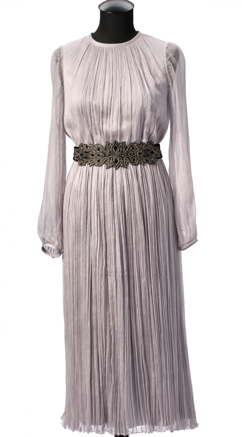 Пояс изготовлен из шелкового бархата, с кожаной аппликацией и украшен стразами Сваровски. Сзади застегивается на металлический крючок.