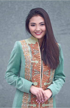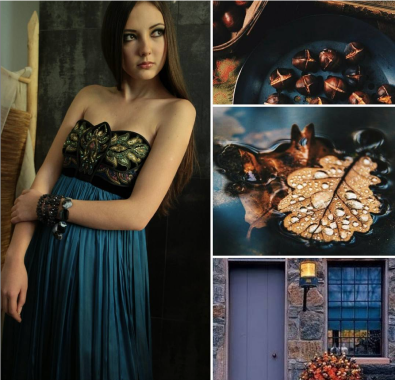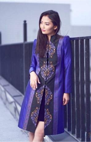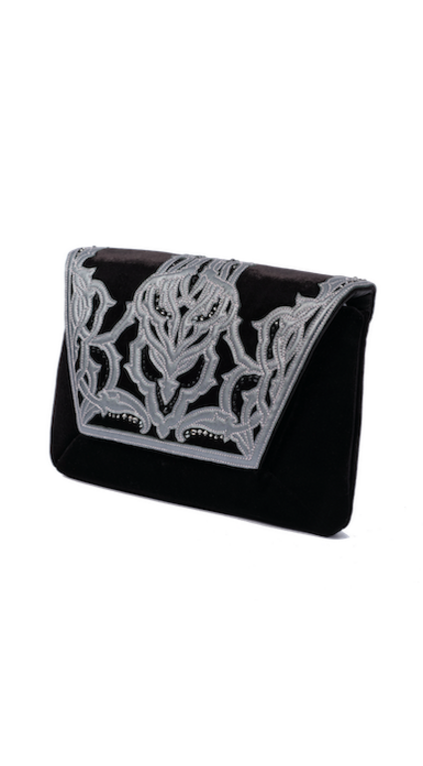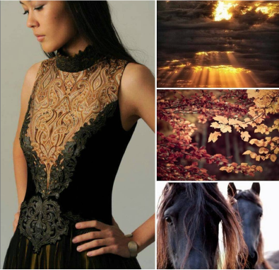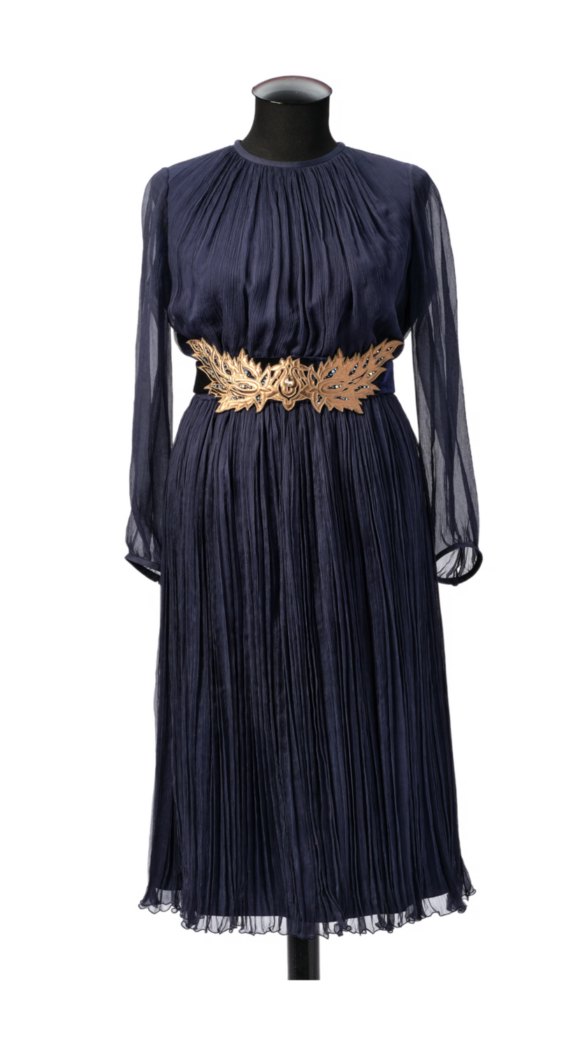 Серая разнообразная палитра развернулась на серой шерсти, муаровом шифоне, пояс расшит оттенками серого шёлка. А вышитые объёмные перья, инкрустированные кристаллами, стали главным украшением образа.