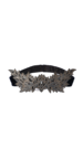 Пояс изготовлен из шелкового бархата, с кожаной аппликацией и украшен стразами Сваровски. Сзади застегивается на металлический крючок.